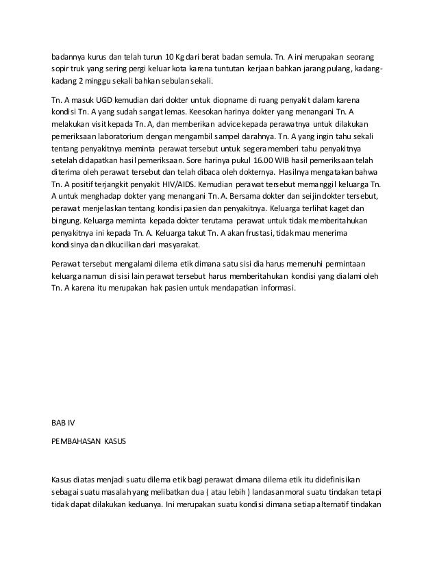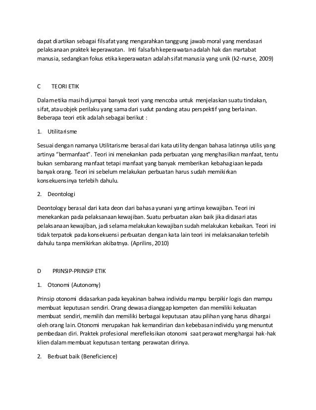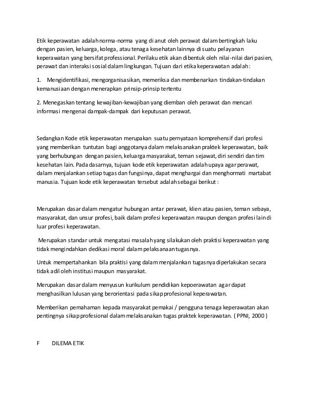 Secara umum tujuan etika keperawatan adalah menciptakan dan mempertahankan kepercayaan antara. Peduli pada pasien merupakan komponen paling penting dari praktek keperawatan terutama pada pasien dalam kondisi terminal Fry 1991. Aturan dalam prinsip kerahasiaan adalah informasi tentang klien harus dijaga privasi klien.